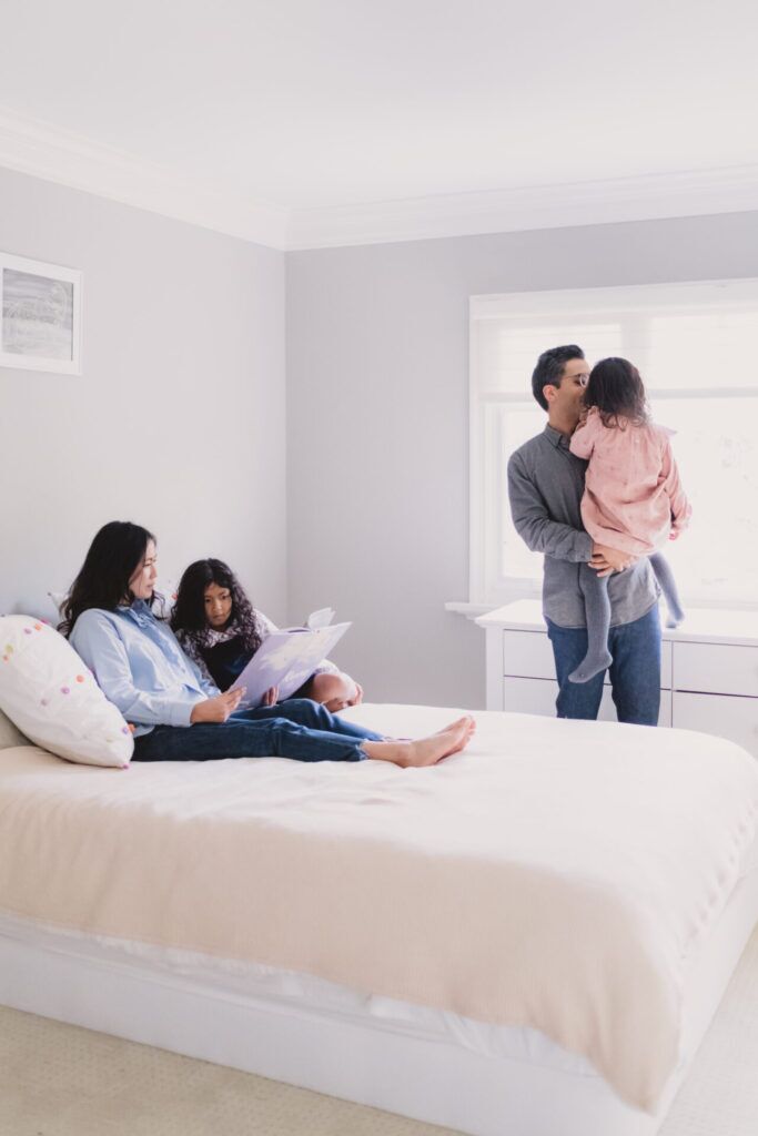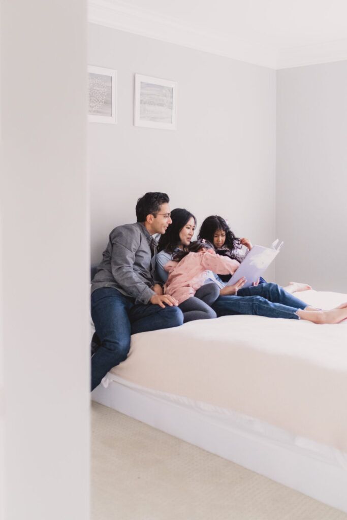 If you are seeking a calm and mellow session, photos in your home could be the perfect fit. I love to start the session with everyone cozied up on the couch or bed. Then we’d get the whole family reading their favourite storybook. Some kids love to show me their toys, jump on their beds, or play a song on the piano. There are no shortage of calming activities around the house.